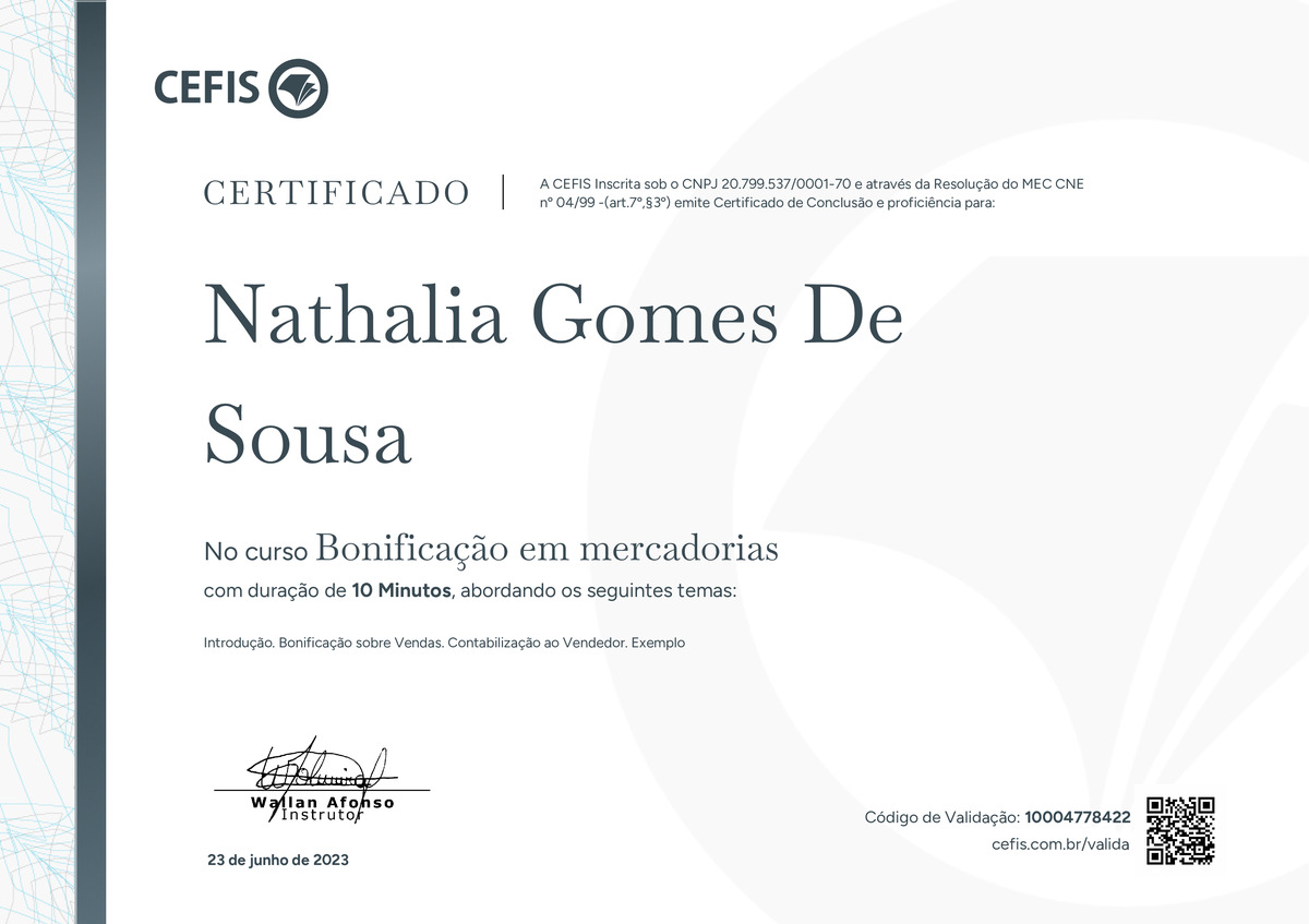 O certificado acima atesta que NATHALIA GOMES DE SOUSA concluiu com êxito o curso Bonificação em mercadorias em 23/06/2023 às 21:06:09,