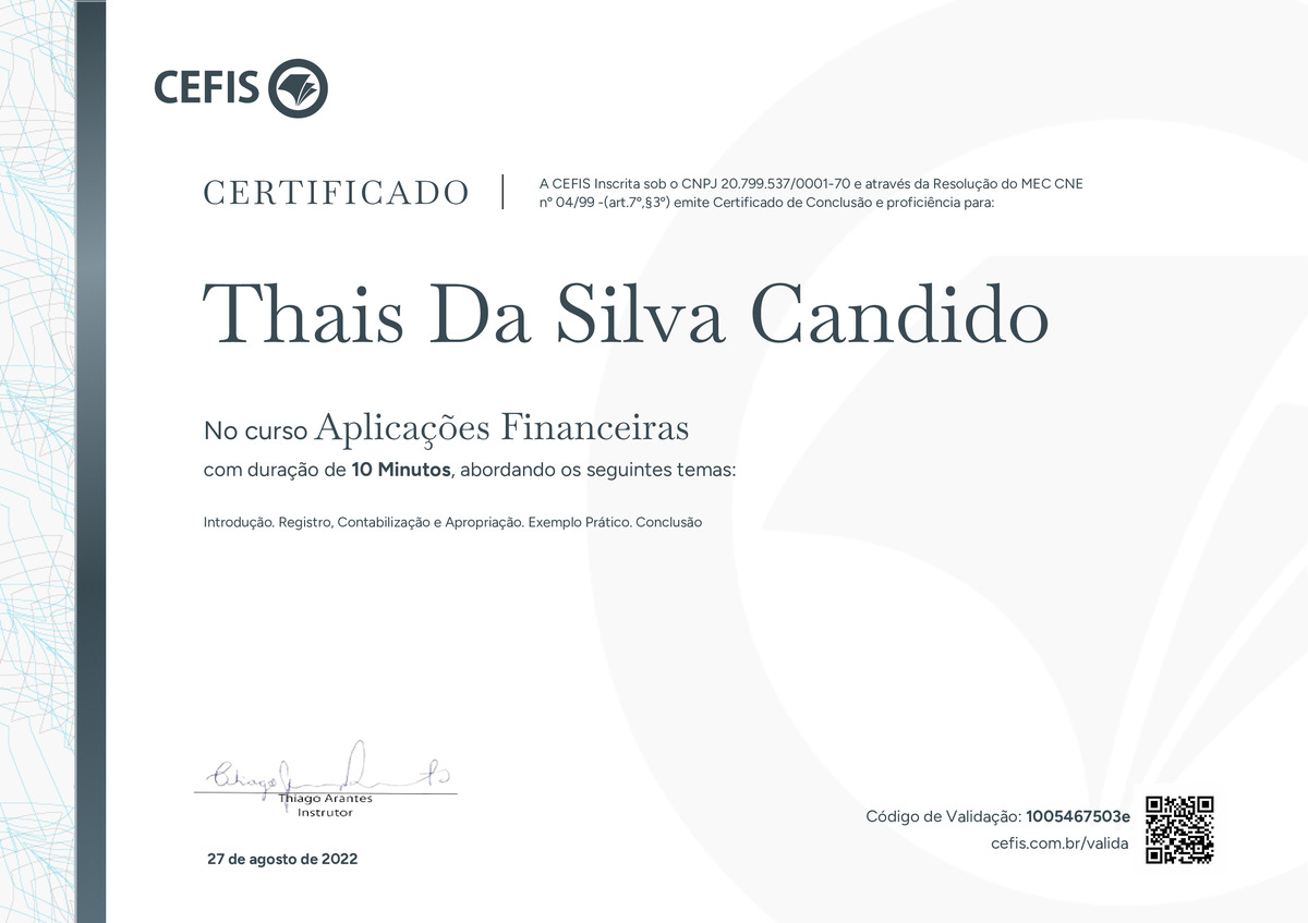 O certificado acima atesta que THAIS DA SILVA CANDIDO concluiu com êxito o curso Aplicações Financeiras em 27/08/2022 às 18:08:56, ministrado por THIAGO ARANTES.