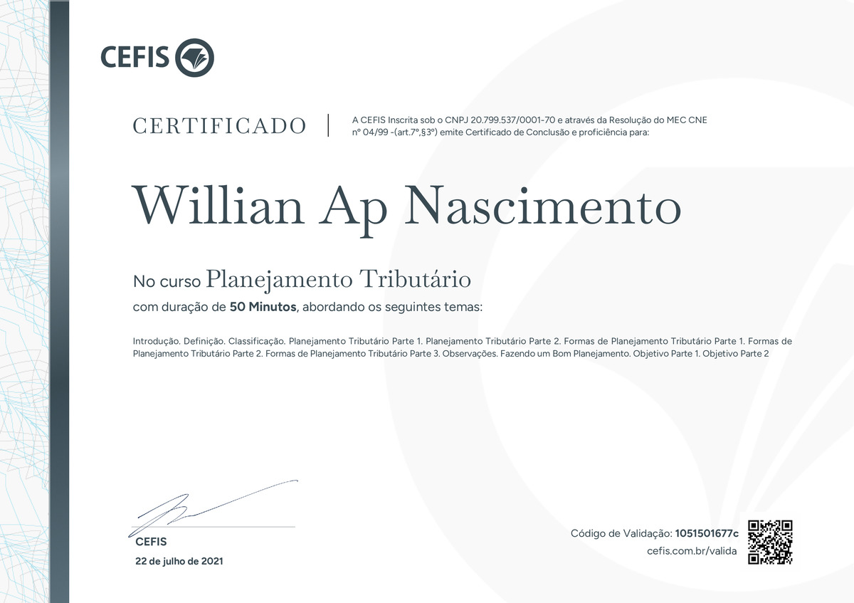 O certificado acima atesta que WILLIAN AP NASCIMENTO concluiu com êxito o curso Planejamento Tributário em 22/07/2021 às 13:07:21, ministrado por JOÃO ARLINDO P. GUSMÃO.