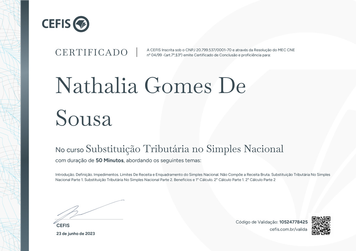O certificado acima atesta que NATHALIA GOMES DE SOUSA concluiu com êxito o curso Substituição Tributária no Simples Nacional em 23/06/2023 às 23:06:43, ministrado por JOÃO ARLINDO P. GUSMÃO.