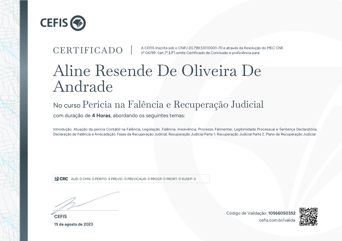 O certificado acima atesta que ALINE RESENDE DE OLIVEIRA DE ANDRADE concluiu com êxito o curso Perícia na Falência e Recuperação Judicial em 15/08/2023 às 17:08:09, ministrado por JOÃO ARLINDO P. GUSMÃO.