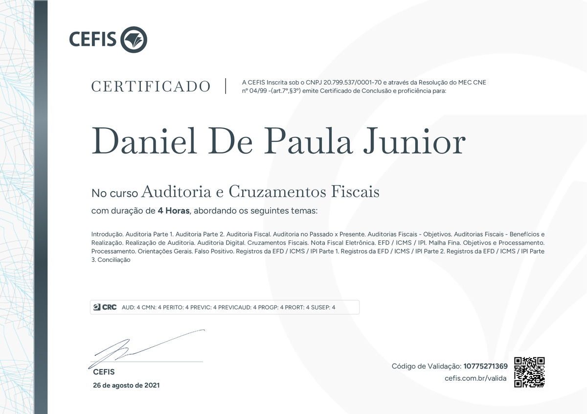O certificado acima atesta que DANIEL DE PAULA JUNIOR concluiu com êxito o curso Auditoria e Cruzamentos Fiscais em 26/08/2021 às 08:08:14,