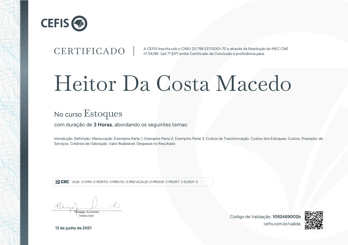 O certificado acima atesta que HEITOR DA COSTA MACEDO concluiu com êxito o curso Estoques em 13/06/2021 às 14:06:50, ministrado por THIAGO ARANTES.