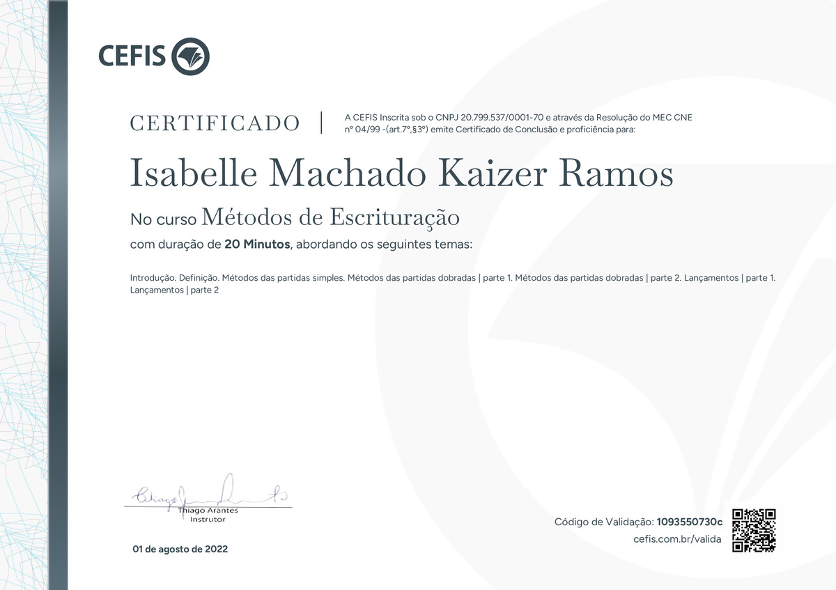 O certificado acima atesta que ISABELLE MACHADO KAIZER RAMOS concluiu com êxito o curso Métodos de Escrituração em 01/08/2022 às 15:08:00,