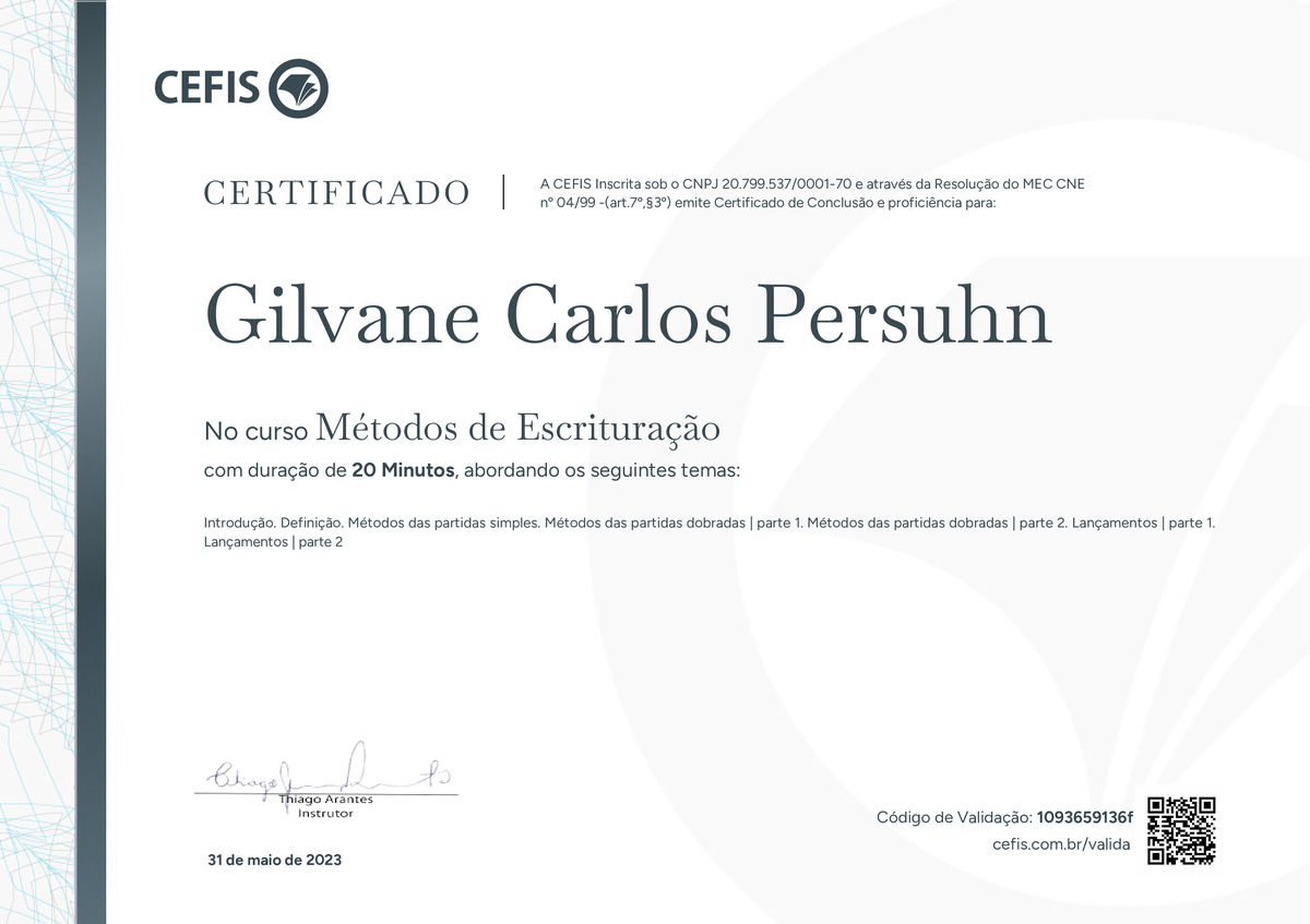 O certificado acima atesta que GILVANE CARLOS PERSUHN concluiu com êxito o curso Métodos de Escrituração em 31/05/2023 às 09:05:48,