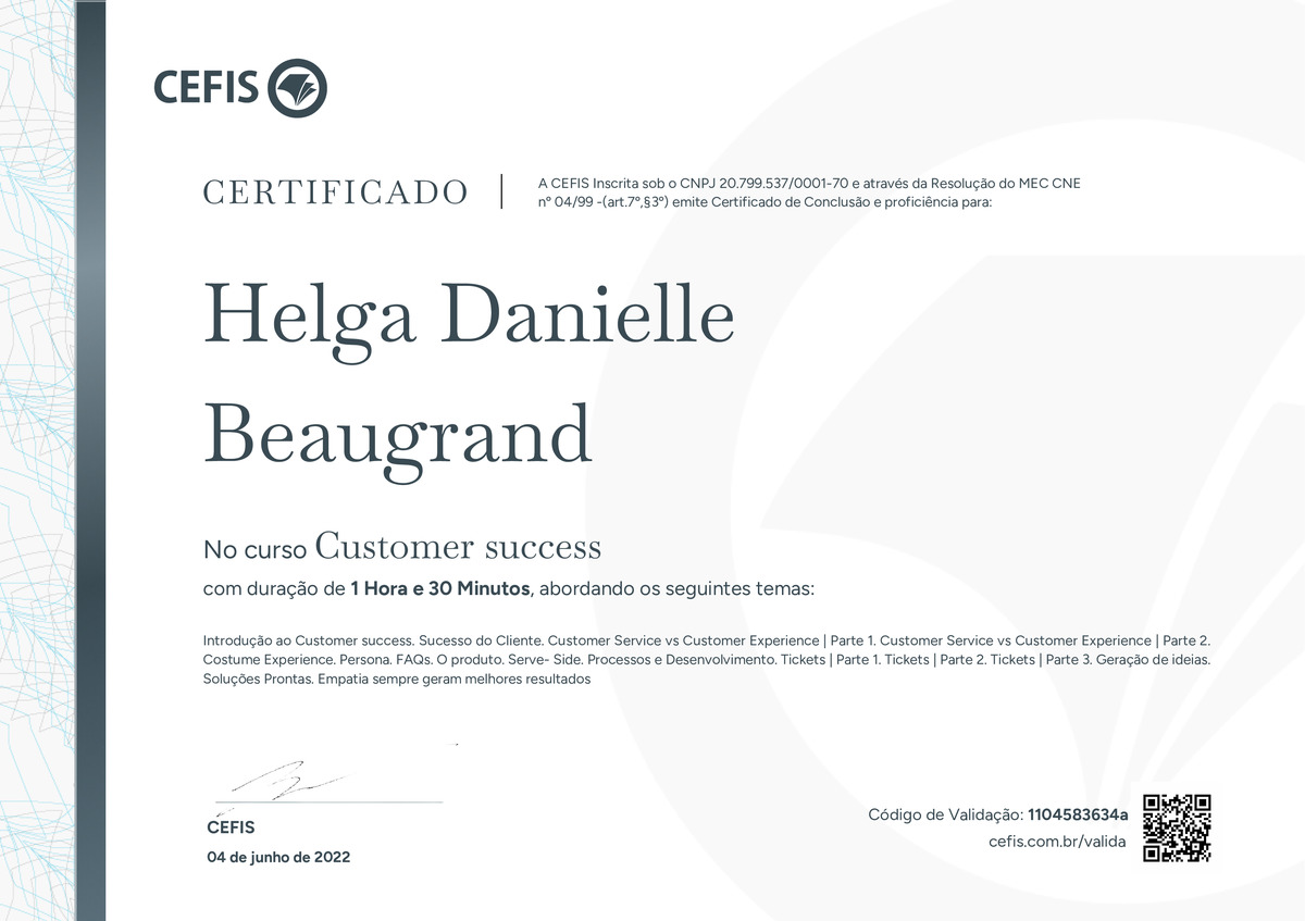 O certificado acima atesta que HELGA DANIELLE BEAUGRAND concluiu com êxito o curso Customer success em 04/06/2022 às 12:06:12, ministrado por CEFIS.