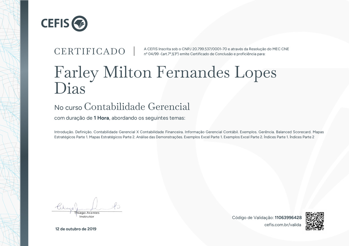 O certificado acima atesta que FARLEY MILTON FERNANDES LOPES DIAS concluiu com êxito o curso Contabilidade Gerencial em 12/10/2019 às 00:10:15,