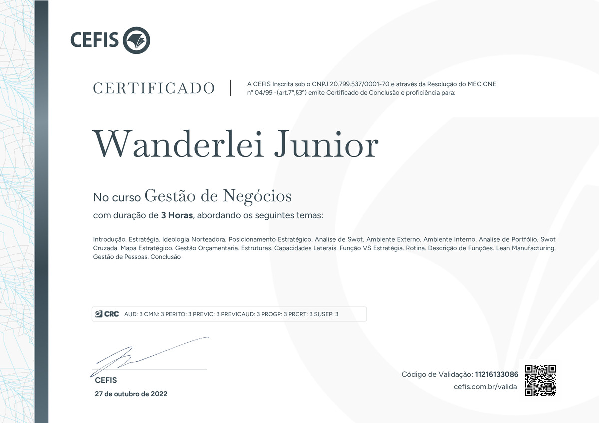 O certificado acima atesta que WANDERLEI JUNIOR concluiu com êxito o curso Gestão de Negócios em 27/10/2022 às 17:10:50,