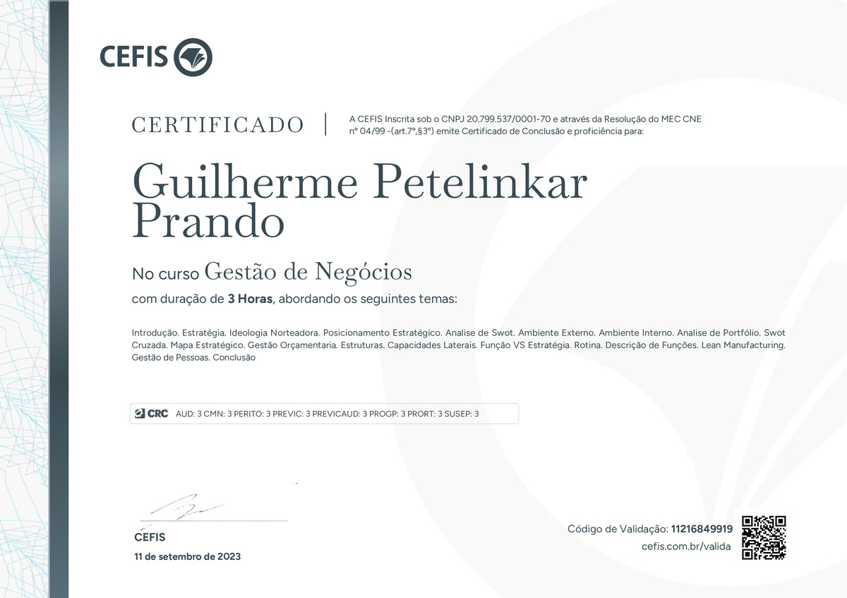 O certificado acima atesta que GUILHERME PETELINKAR PRANDO concluiu com êxito o curso Gestão de Negócios em 11/09/2023 às 16:09:16, ministrado por LUCAS MARQUES VIEIRA.