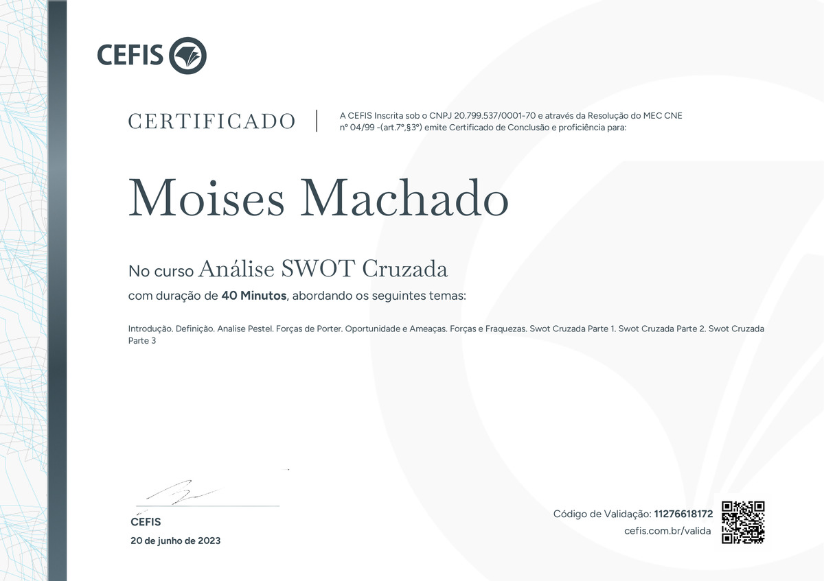 O certificado acima atesta que MOISES MACHADO concluiu com êxito o curso Análise SWOT Cruzada em 20/06/2023 às 20:06:37,