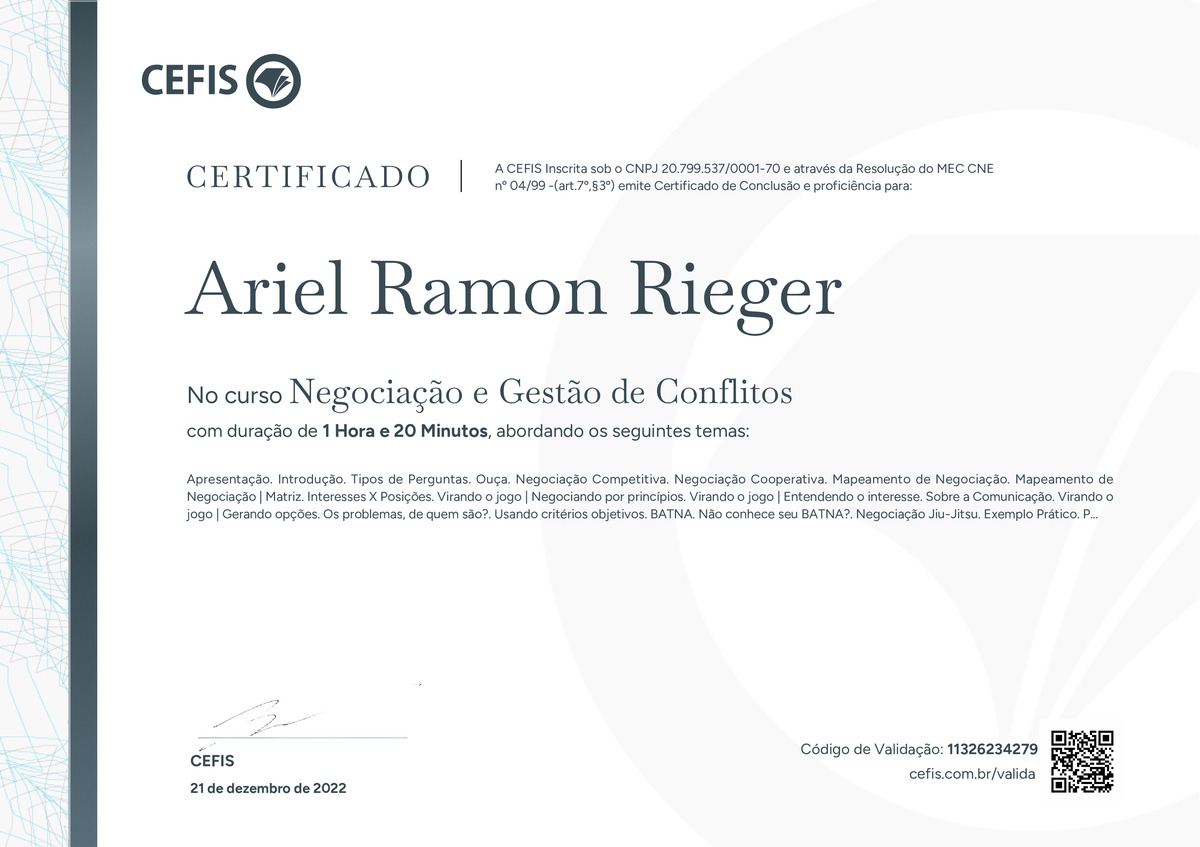 O certificado acima atesta que ARIEL RAMON RIEGER concluiu com êxito o curso Negociação e Gestão de Conflitos em 21/12/2022 às 22:12:43,