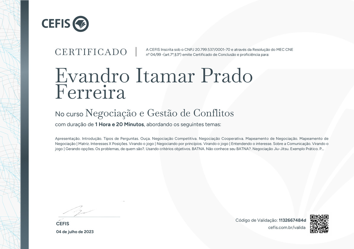 O certificado acima atesta que EVANDRO ITAMAR PRADO FERREIRA concluiu com êxito o curso Negociação e Gestão de Conflitos em 04/07/2023 às 22:07:21,