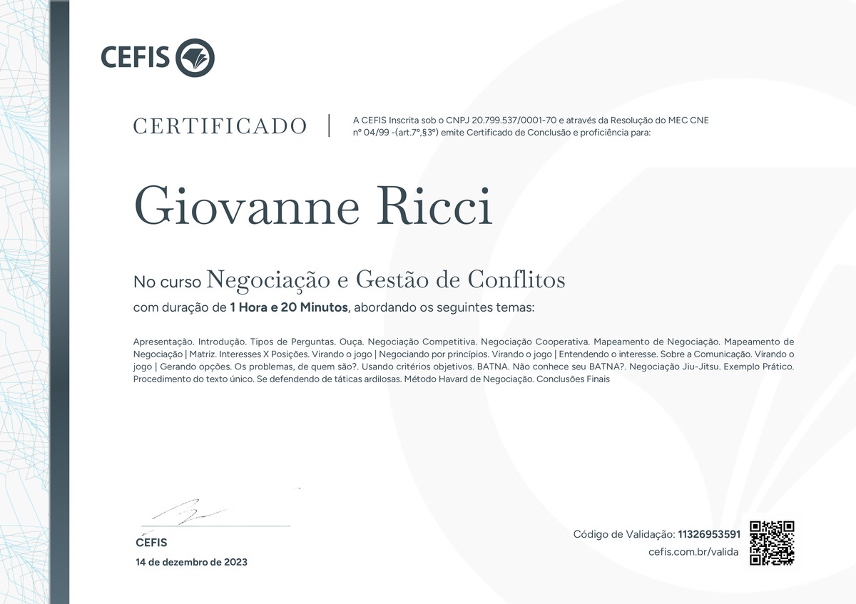 O certificado acima atesta que GIOVANNE RICCI concluiu com êxito o curso Negociação e Gestão de Conflitos em 14/12/2023 às 15:12:20, ministrado por LUCAS MARQUES VIEIRA.