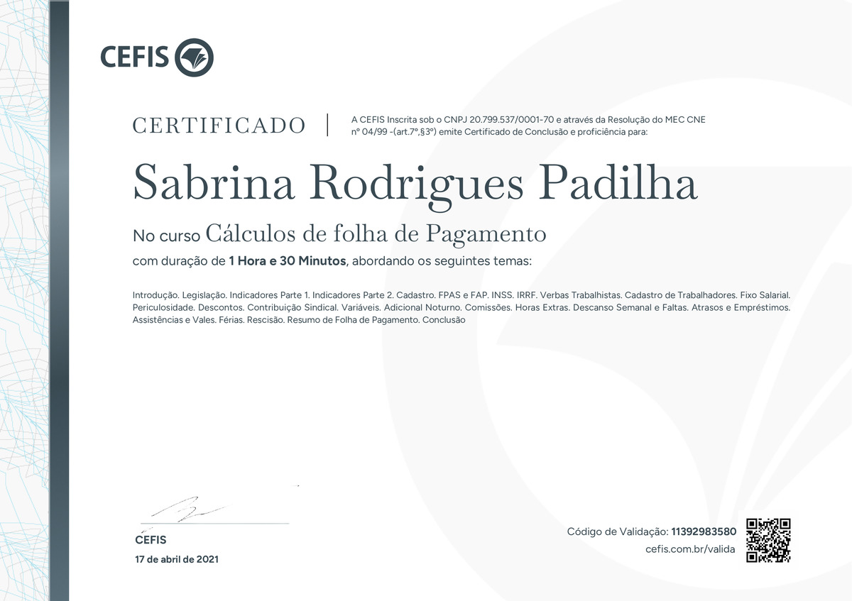 O certificado acima atesta que SABRINA RODRIGUES PADILHA concluiu com êxito o curso Cálculos de folha de Pagamento em 17/04/2021 às 23:04:26,