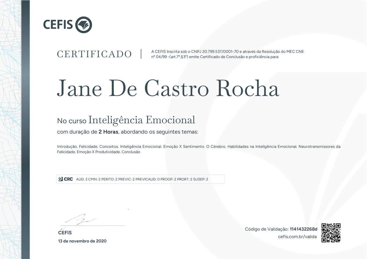 O certificado acima atesta que JANE DE CASTRO ROCHA concluiu com êxito o curso Inteligência Emocional em 13/11/2020 às 12:11:07,