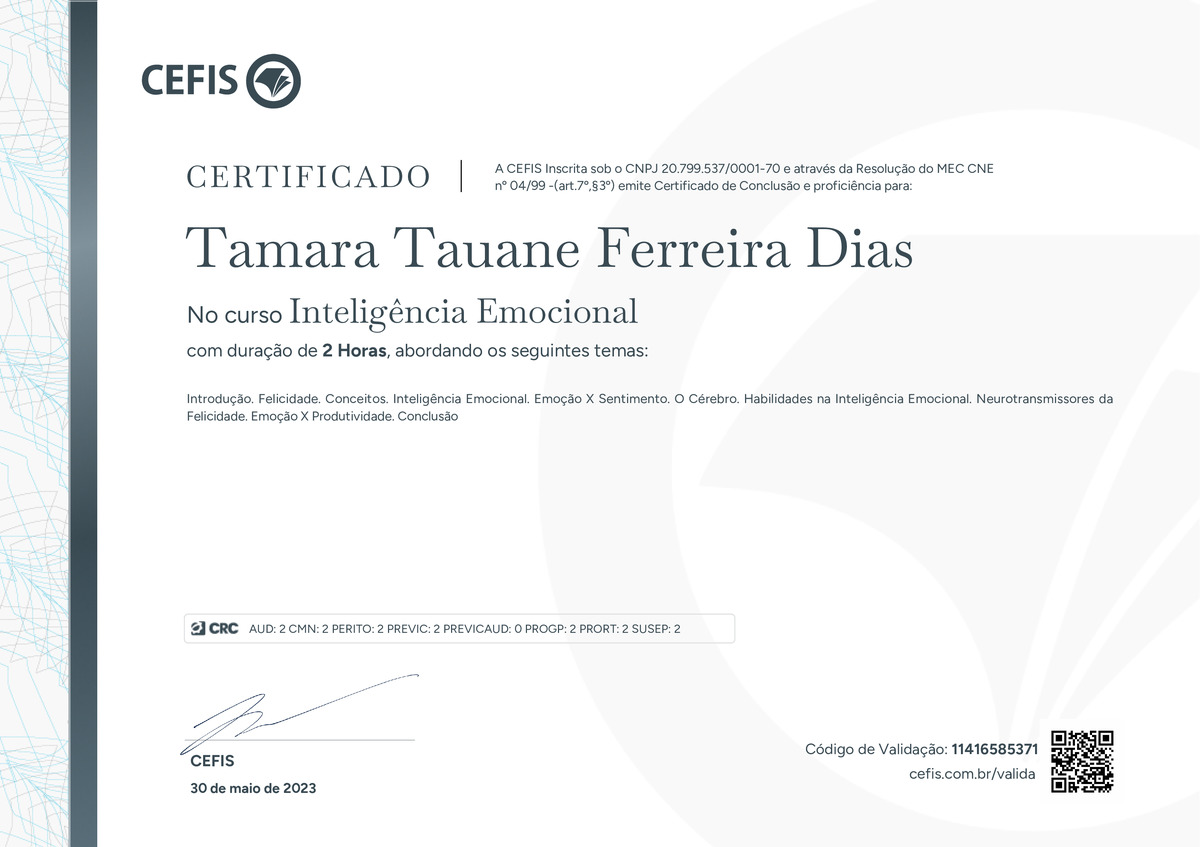 O certificado acima atesta que TAMARA TAUANE FERREIRA DIAS concluiu com êxito o curso Inteligência Emocional em 30/05/2023 às 15:05:22,