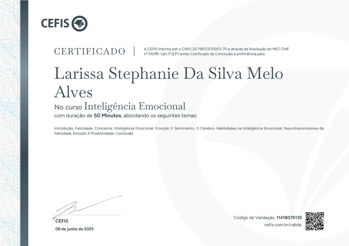 O certificado acima atesta que LARISSA STEPHANIE DA SILVA MELO ALVES concluiu com êxito o curso Inteligência Emocional em 08/06/2025 às 00:06:51, ministrado por DANIEL VIEIRA.