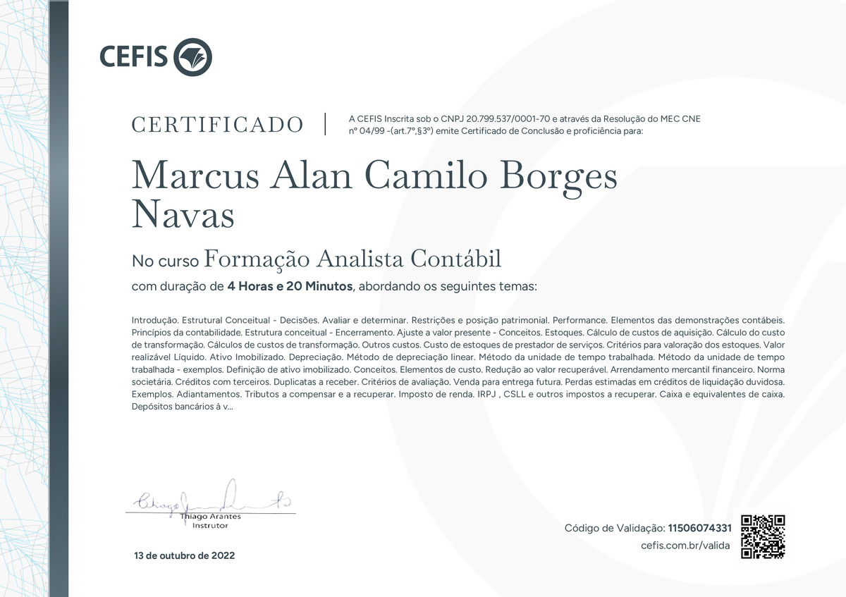 O certificado acima atesta que MARCUS ALAN CAMILO BORGES NAVAS concluiu com êxito o curso Formação Analista Contábil em 13/10/2022 às 10:10:45, ministrado por THIAGO ARANTES.