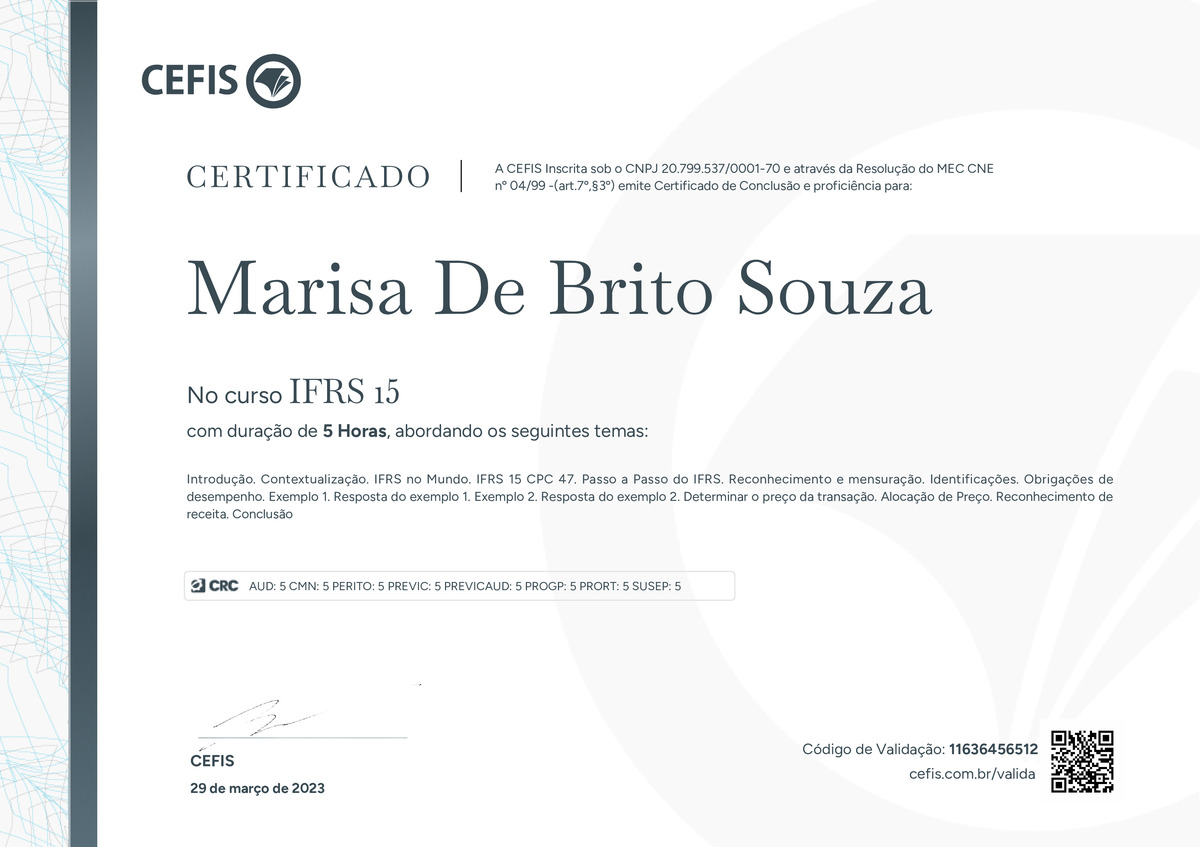 O certificado acima atesta que MARISA DE BRITO SOUZA concluiu com êxito o curso IFRS 15 em 29/03/2023 às 19:03:35,