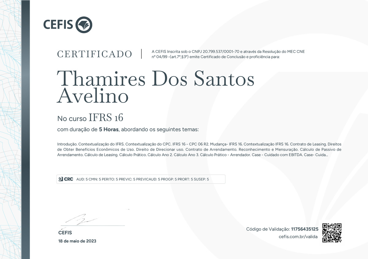 O certificado acima atesta que THAMIRES DOS SANTOS AVELINO concluiu com êxito o curso IFRS 16 em 18/05/2023 às 10:05:52, ministrado por TIAGO DE VASCONCELOS.
