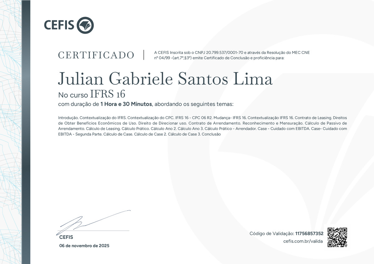 O certificado acima atesta que JULIAN GABRIELE SANTOS LIMA concluiu com êxito o curso IFRS 16 em 06/11/2025 às 12:11:36,