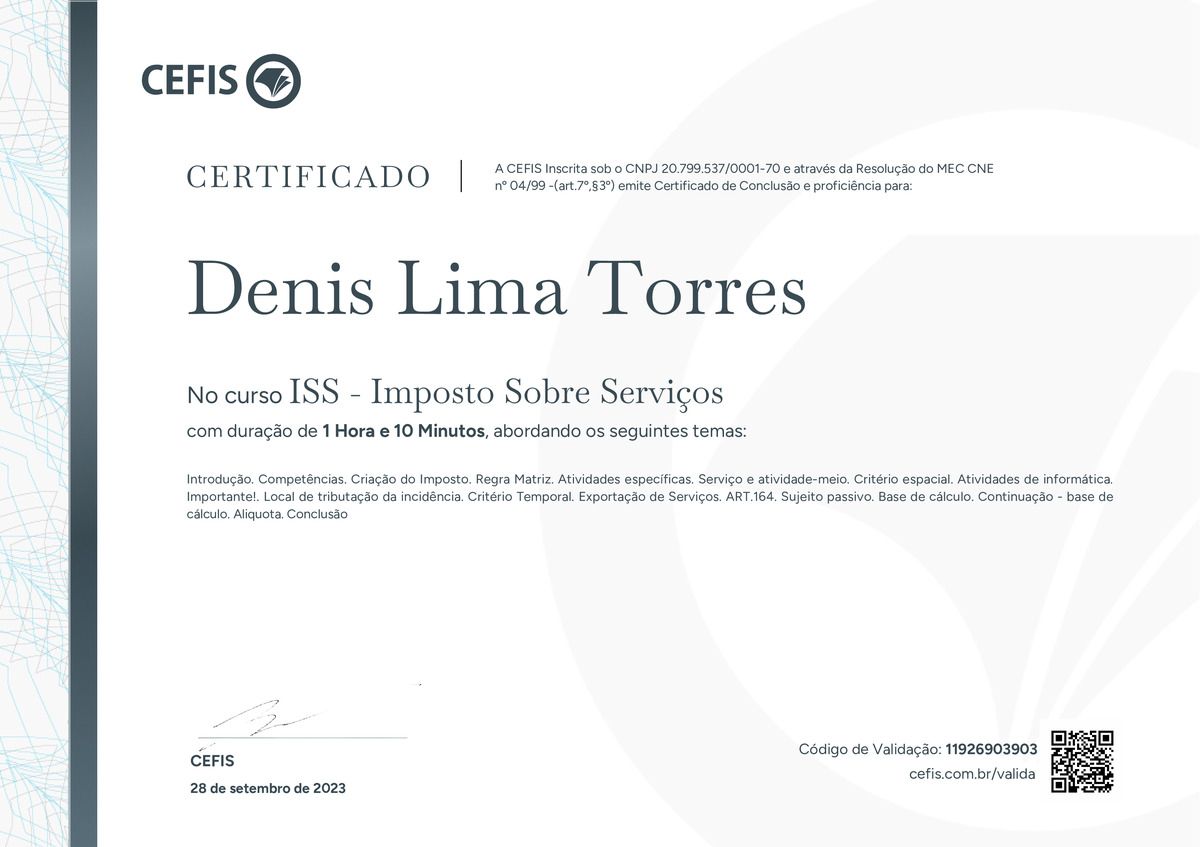 O certificado acima atesta que Denis Lima Torres concluiu com êxito o curso ISS - Imposto Sobre Serviços em 28/09/2023 às 20:09:11,