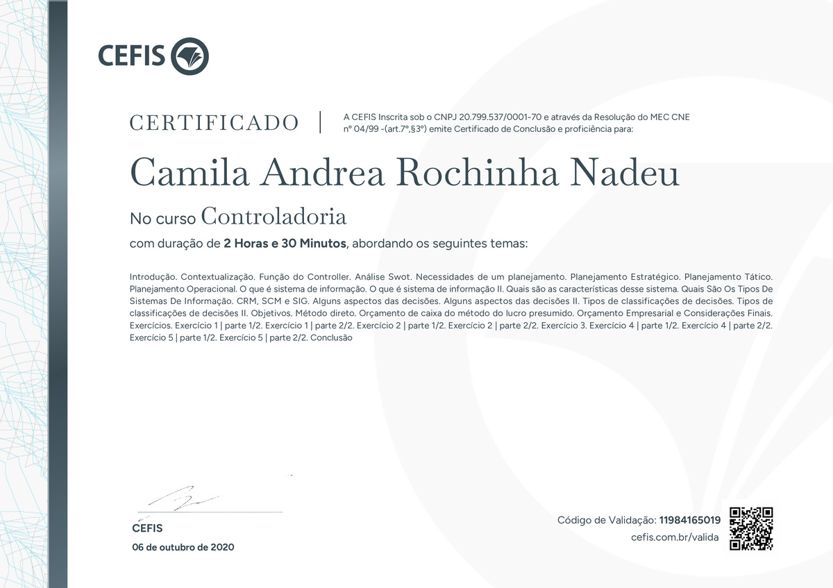 O certificado acima atesta que CAMILA ANDREA ROCHINHA NADEU concluiu com êxito o curso Controladoria em 06/10/2020 às 08:10:08, ministrado por KLEBER MEDRADO.