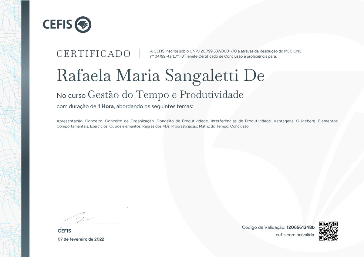 O certificado acima atesta que RAFAELA MARIA SANGALETTI DE OLIVEIRA concluiu com êxito o curso Gestão do Tempo e Produtividade em 07/02/2022 às 21:02:24,