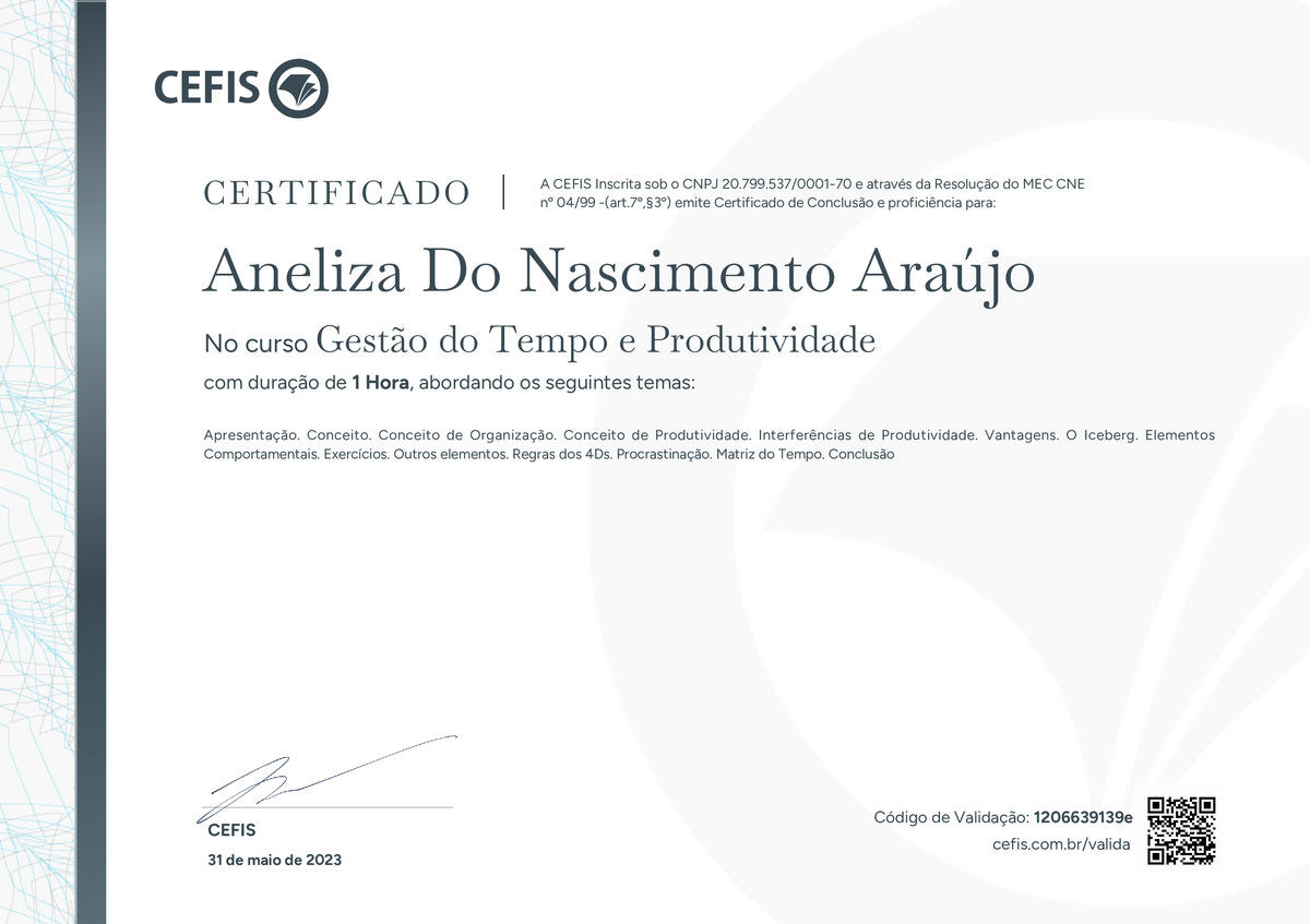 O certificado acima atesta que ANELIZA DO NASCIMENTO ARAÚJO concluiu com êxito o curso Gestão do Tempo e Produtividade em 31/05/2023 às 11:05:03, ministrado por DANIEL VIEIRA.