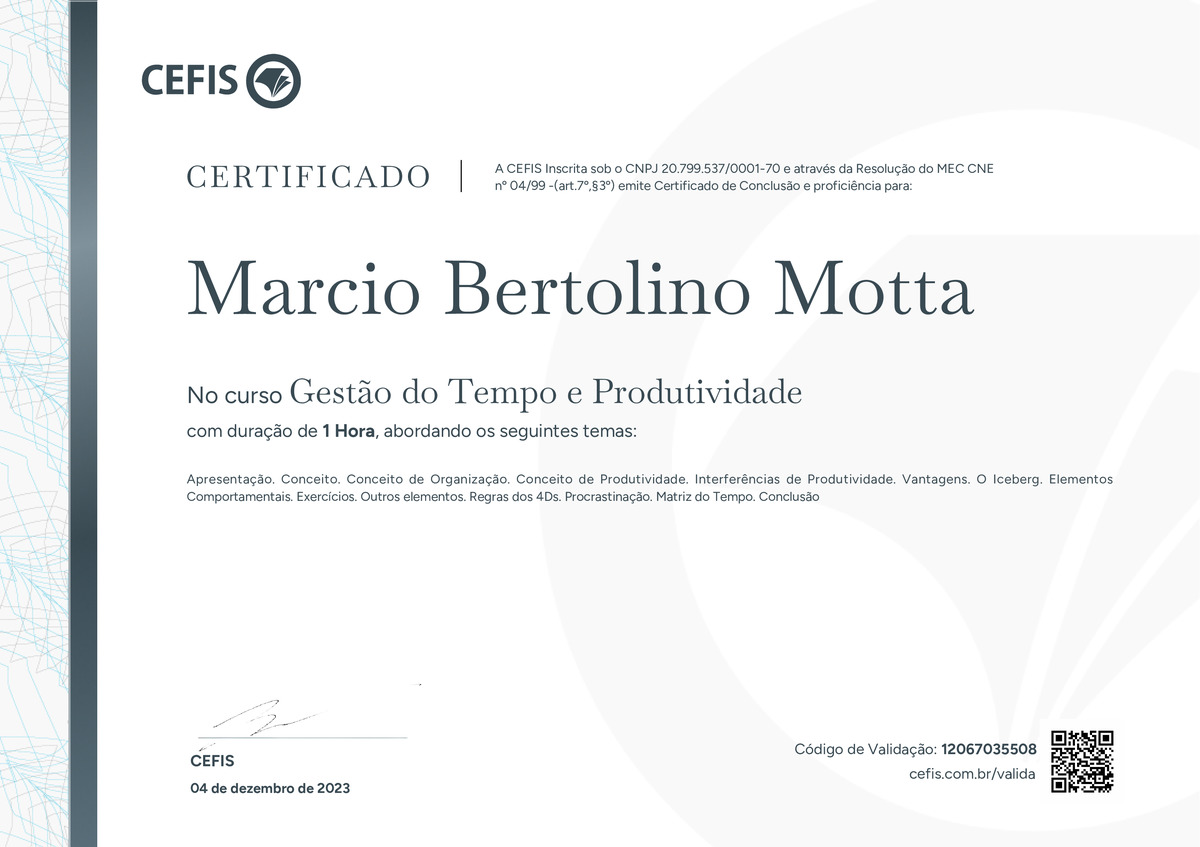 O certificado acima atesta que MARCIO BERTOLINO MOTTA concluiu com êxito o curso Gestão do Tempo e Produtividade em 04/12/2023 às 08:12:45,