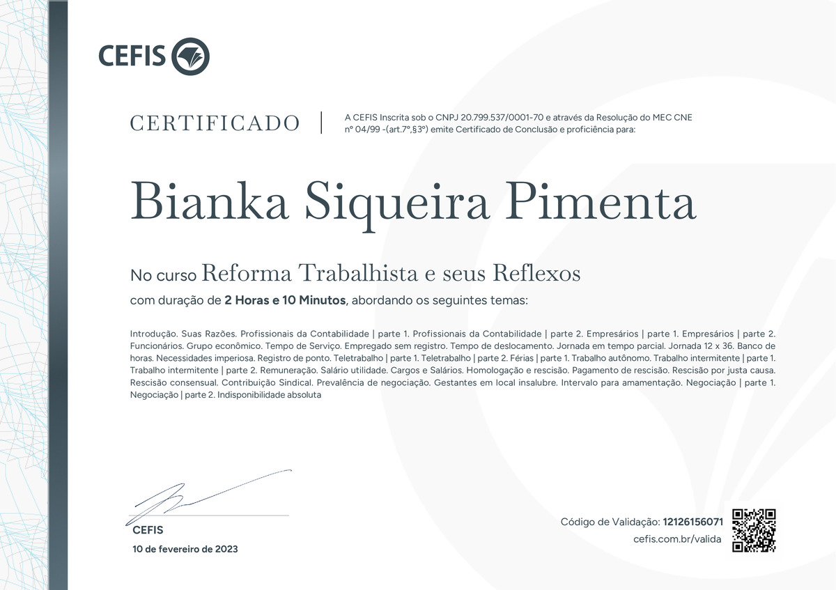 O certificado acima atesta que BIANKA SIQUEIRA PIMENTA concluiu com êxito o curso Reforma Trabalhista e seus Reflexos em 10/02/2023 às 16:02:04, ministrado por JEFFERSON DANTAS.