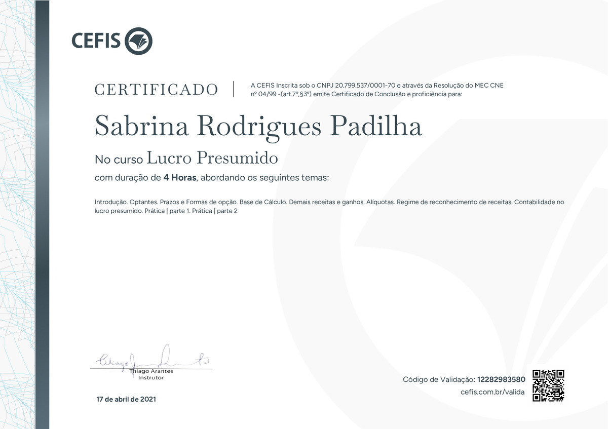 O certificado acima atesta que SABRINA RODRIGUES PADILHA concluiu com êxito o curso Lucro Presumido em 17/04/2021 às 22:04:37,