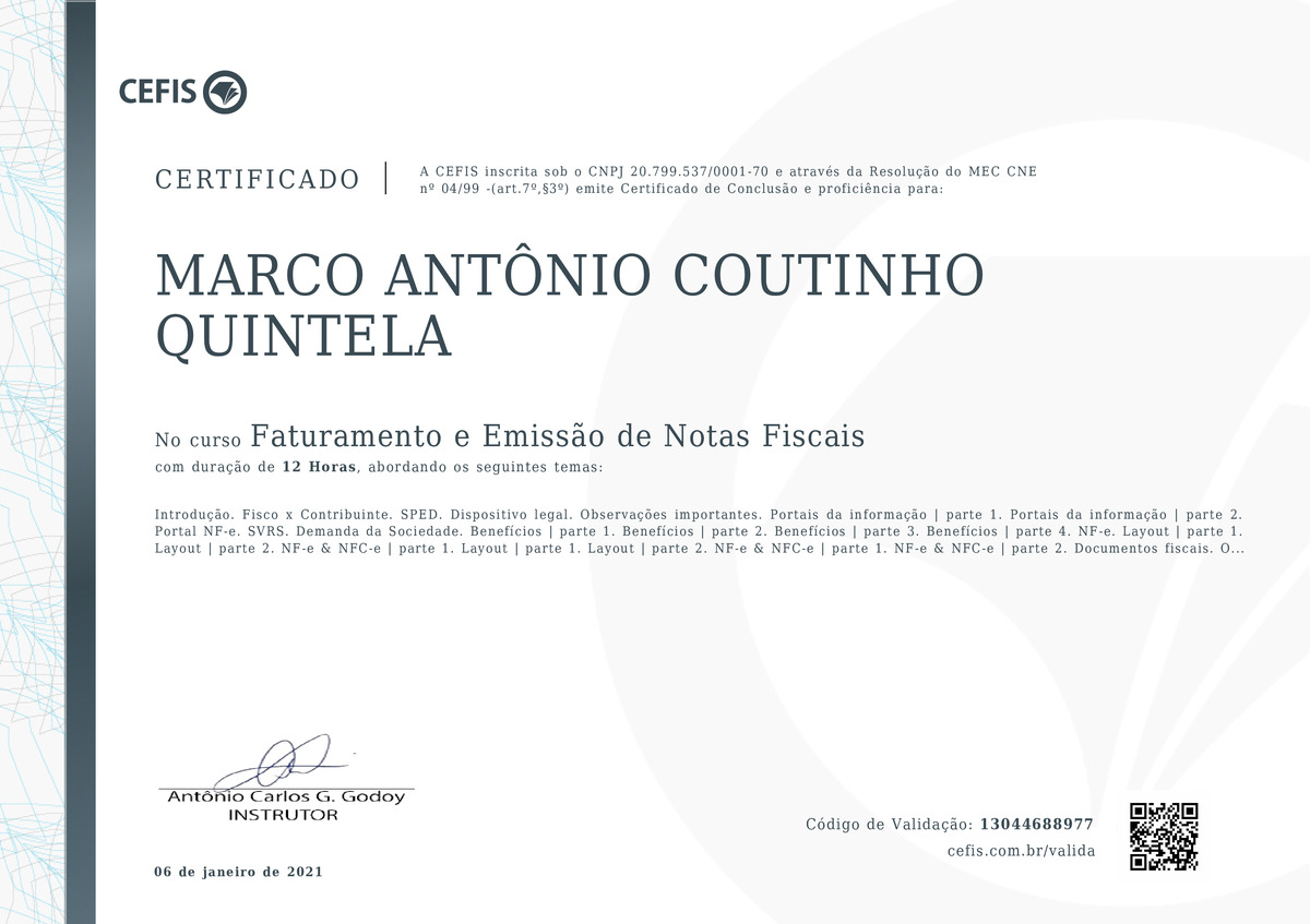 O certificado acima atesta que MARCO ANTÔNIO COUTINHO QUINTELA concluiu com êxito o curso Faturamento e Emissão de Notas Fiscais em 06/01/2021 às 08:01:31,