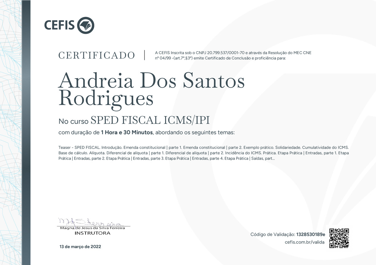 O certificado acima atesta que ANDREIA DOS SANTOS RODRIGUES concluiu com êxito o curso SPED FISCAL ICMS/IPI em 13/03/2022 às 11:03:09, ministrado por MAGNA FERREIRA.