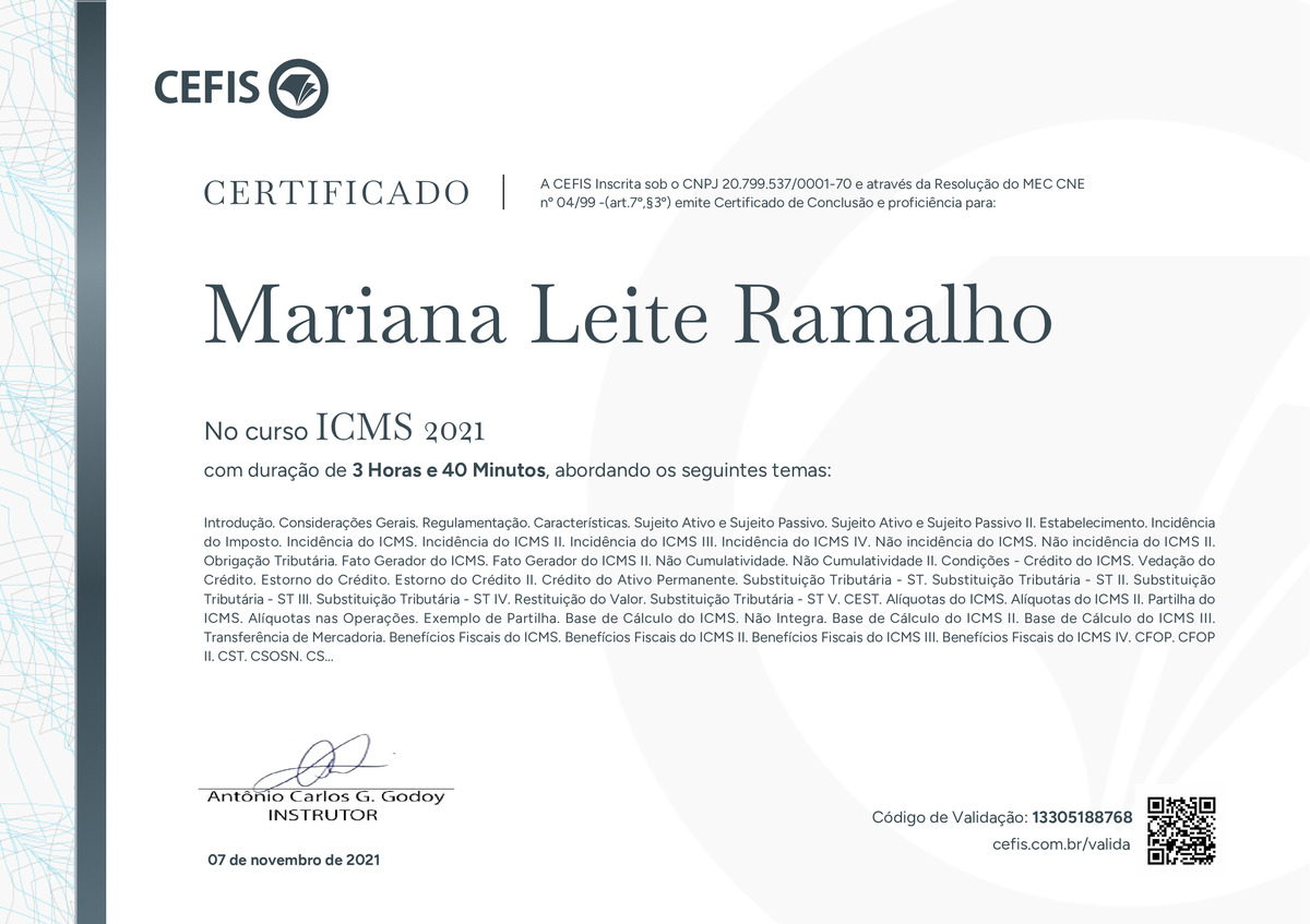 O certificado acima atesta que MARIANA LEITE RAMALHO concluiu com êxito o curso ICMS 2021 em 07/11/2021 às 16:11:14,