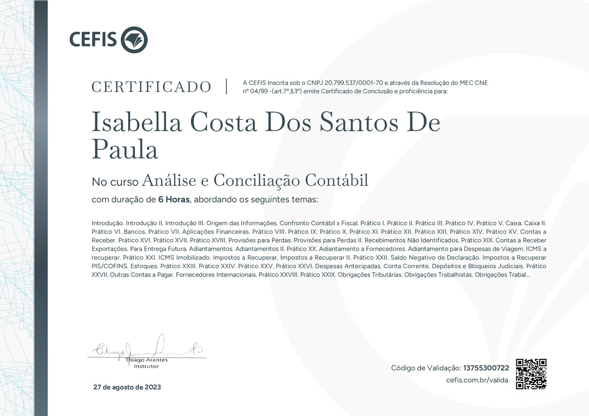 O certificado acima atesta que ISABELLA COSTA DOS SANTOS DE PAULA concluiu com êxito o curso Análise e Conciliação Contábil em 27/08/2023 às 15:08:50,