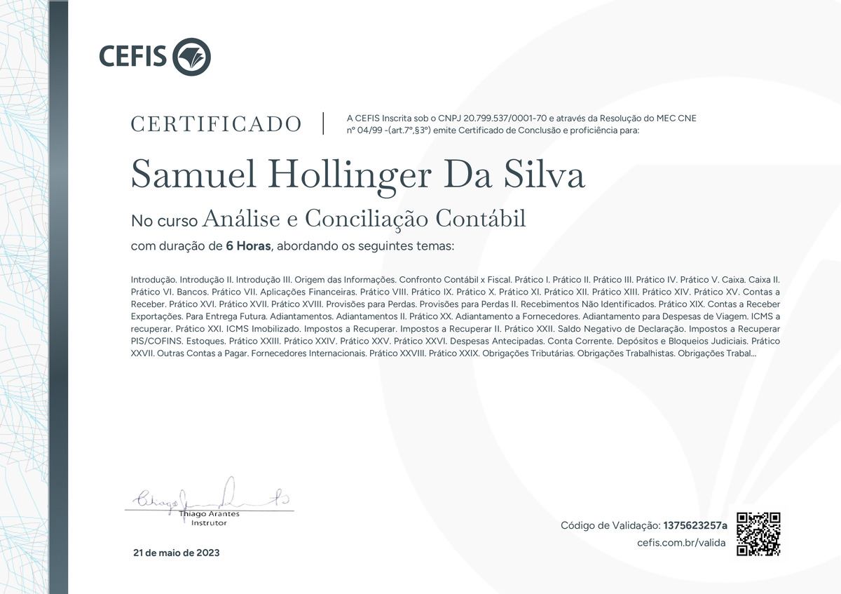 O certificado acima atesta que SAMUEL HOLLINGER DA SILVA concluiu com êxito o curso Análise e Conciliação Contábil em 21/05/2023 às 15:05:45,