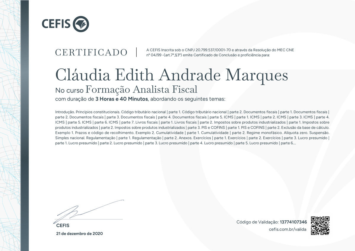 O certificado acima atesta que CLÁUDIA EDITH ANDRADE MARQUES concluiu com êxito o curso Formação Analista Fiscal em 21/12/2020 às 11:12:43,