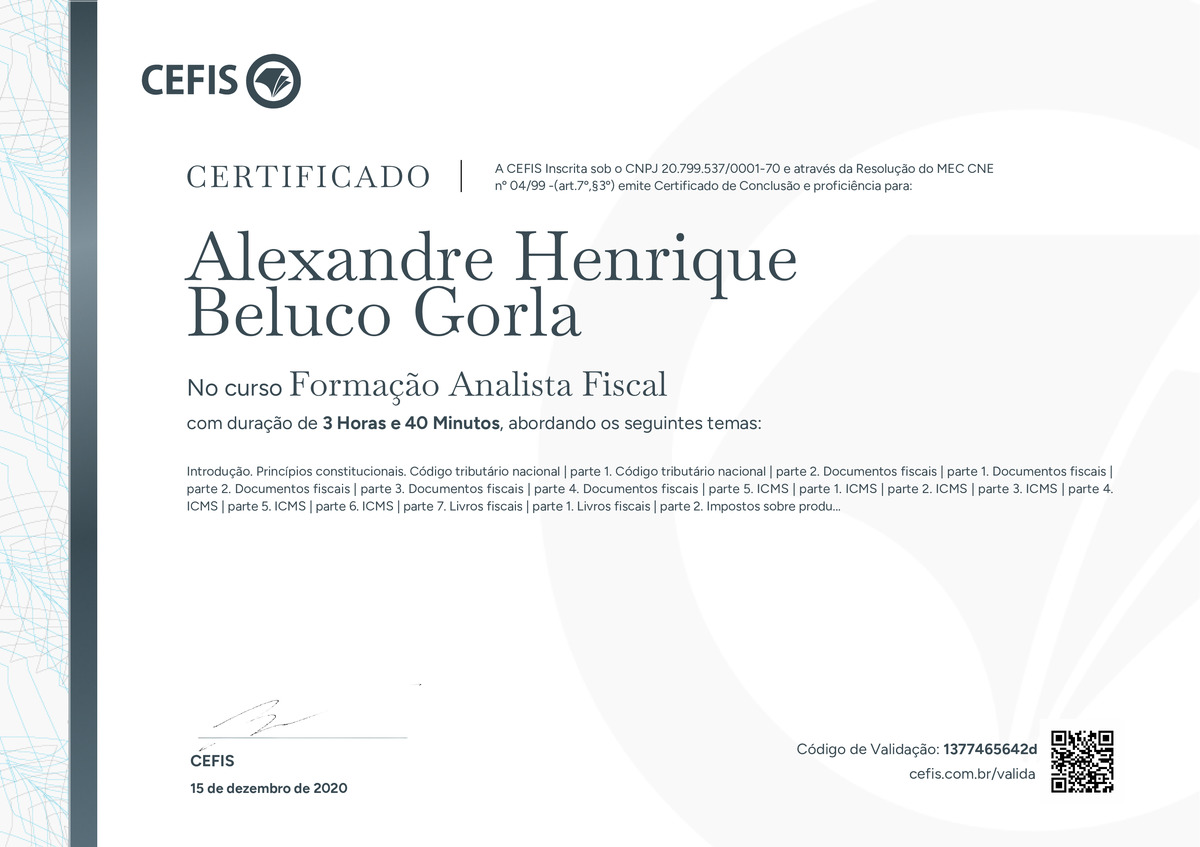 O certificado acima atesta que ALEXANDRE HENRIQUE BELUCO GORLA concluiu com êxito o curso Formação Analista Fiscal em 15/12/2020 às 21:12:58,