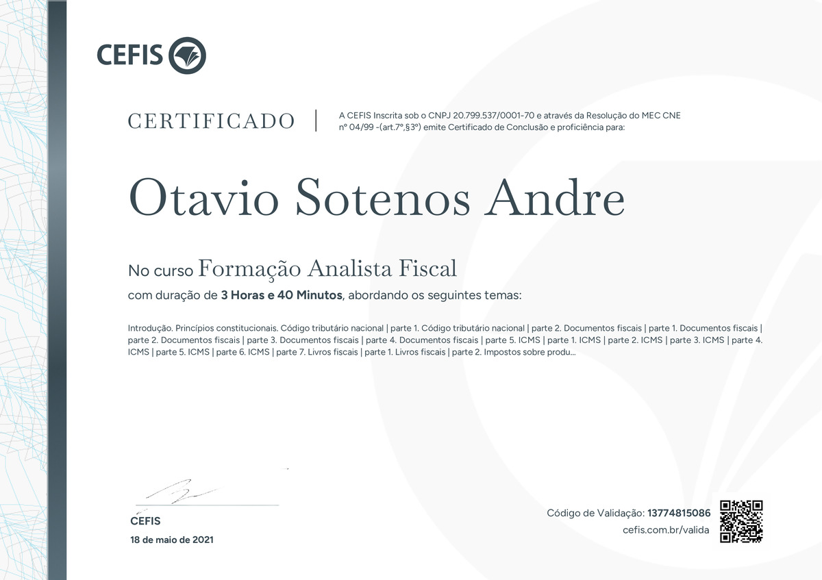 O certificado acima atesta que OTAVIO SOTENOS ANDRE concluiu com êxito o curso Formação Analista Fiscal em 18/05/2021 às 20:05:45,