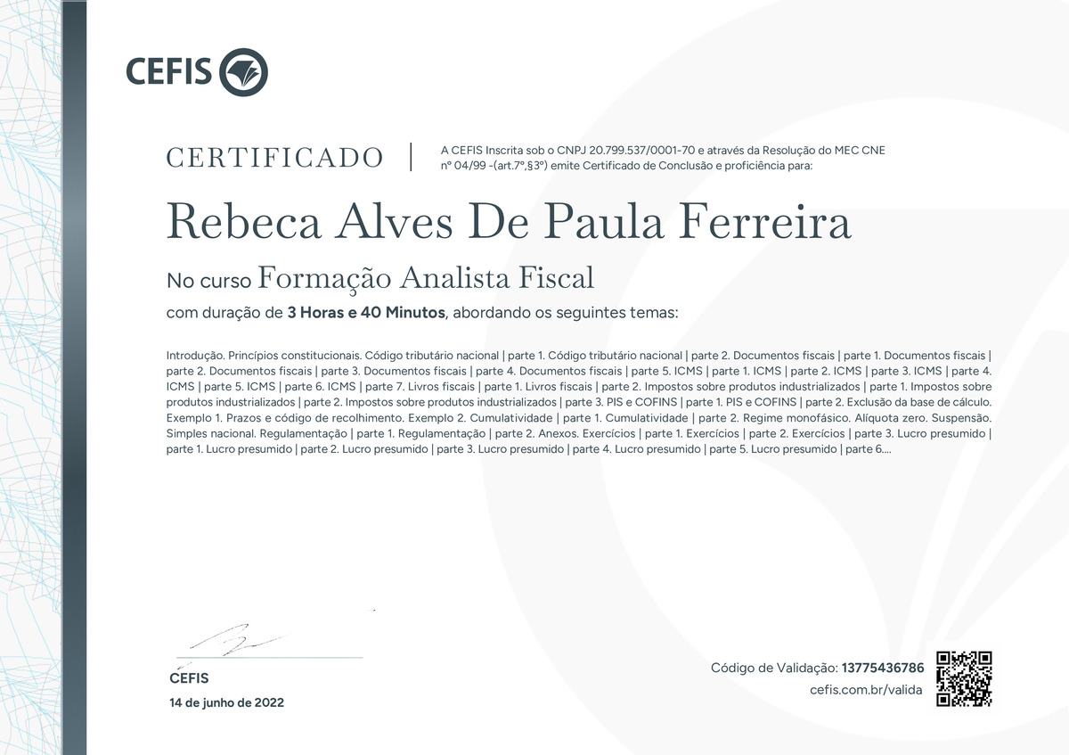 O certificado acima atesta que REBECA ALVES DE PAULA FERREIRA concluiu com êxito o curso Formação Analista Fiscal em 14/06/2022 às 23:06:17, ministrado por JOÃO OLIVEIRA.