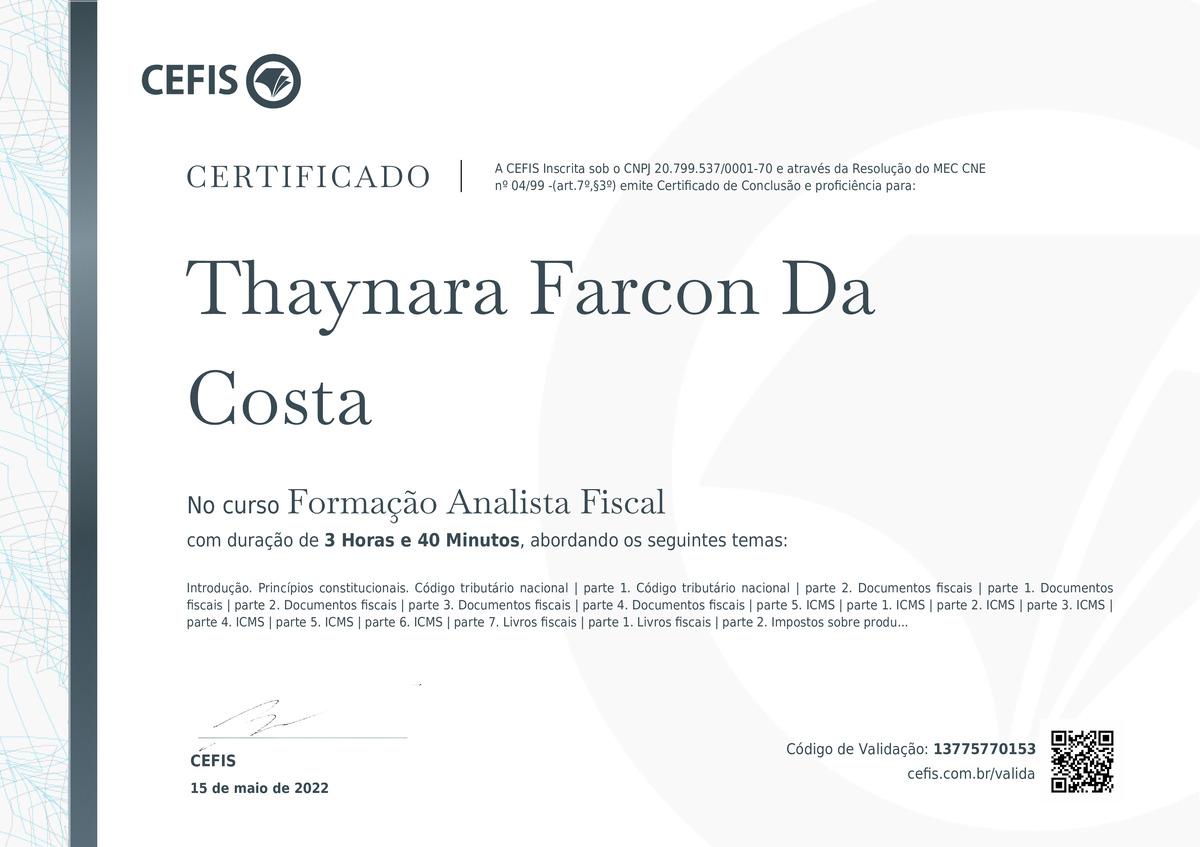 O certificado acima atesta que THAYNARA FARCON DA COSTA concluiu com êxito o curso Formação Analista Fiscal em 15/05/2022 às 11:05:38,