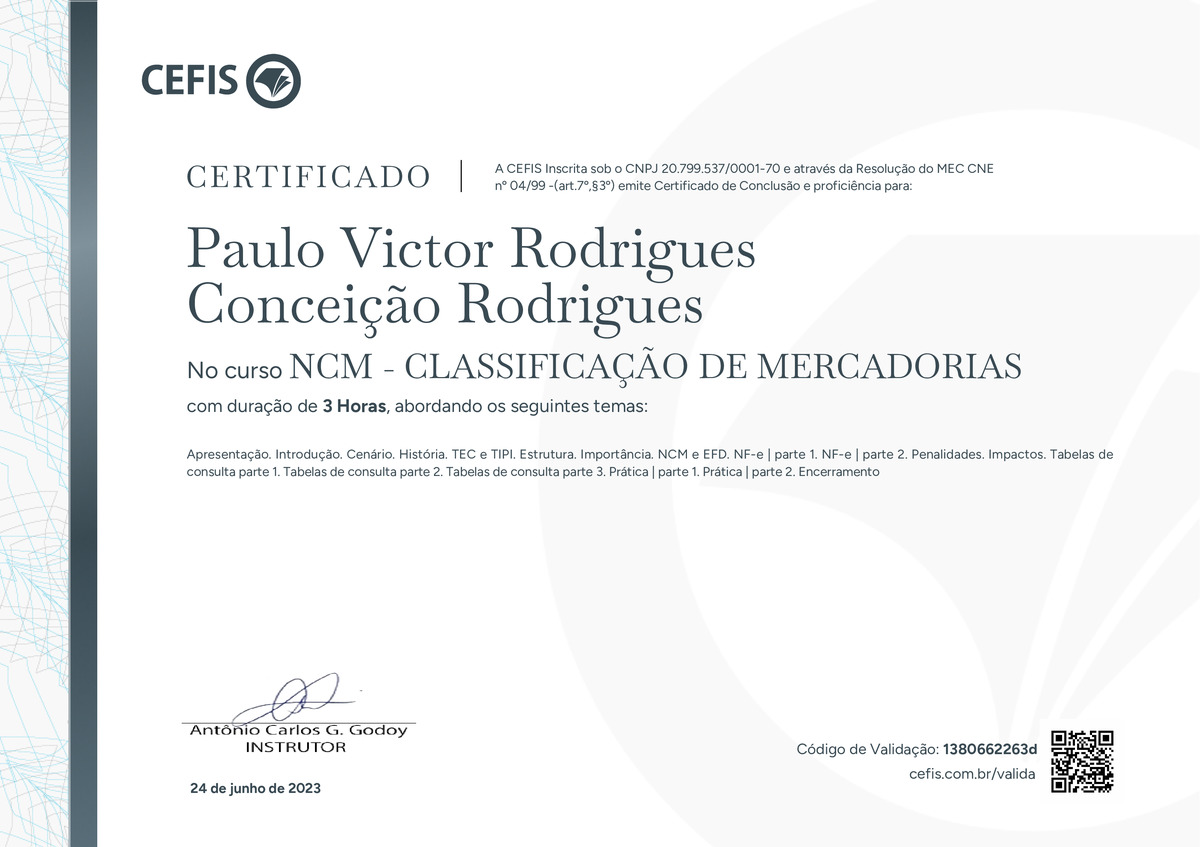 O certificado acima atesta que PAULO VICTOR RODRIGUES CONCEIÇÃO RODRIGUES concluiu com êxito o curso NCM - CLASSIFICAÇÃO DE MERCADORIAS em 24/06/2023 às 12:06:20,