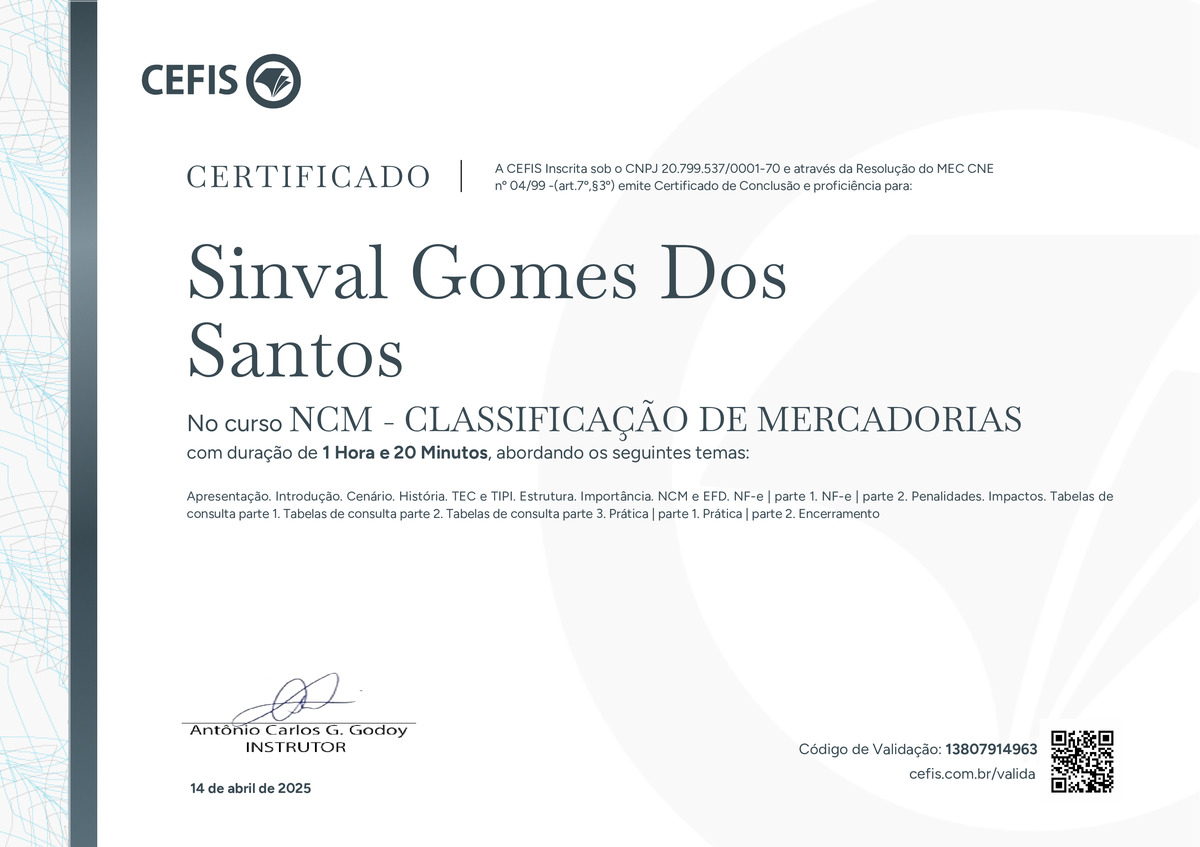 O certificado acima atesta que SINVAL GOMES DOS SANTOS concluiu com êxito o curso NCM - CLASSIFICAÇÃO DE MERCADORIAS em 14/04/2025 às 08:04:48,