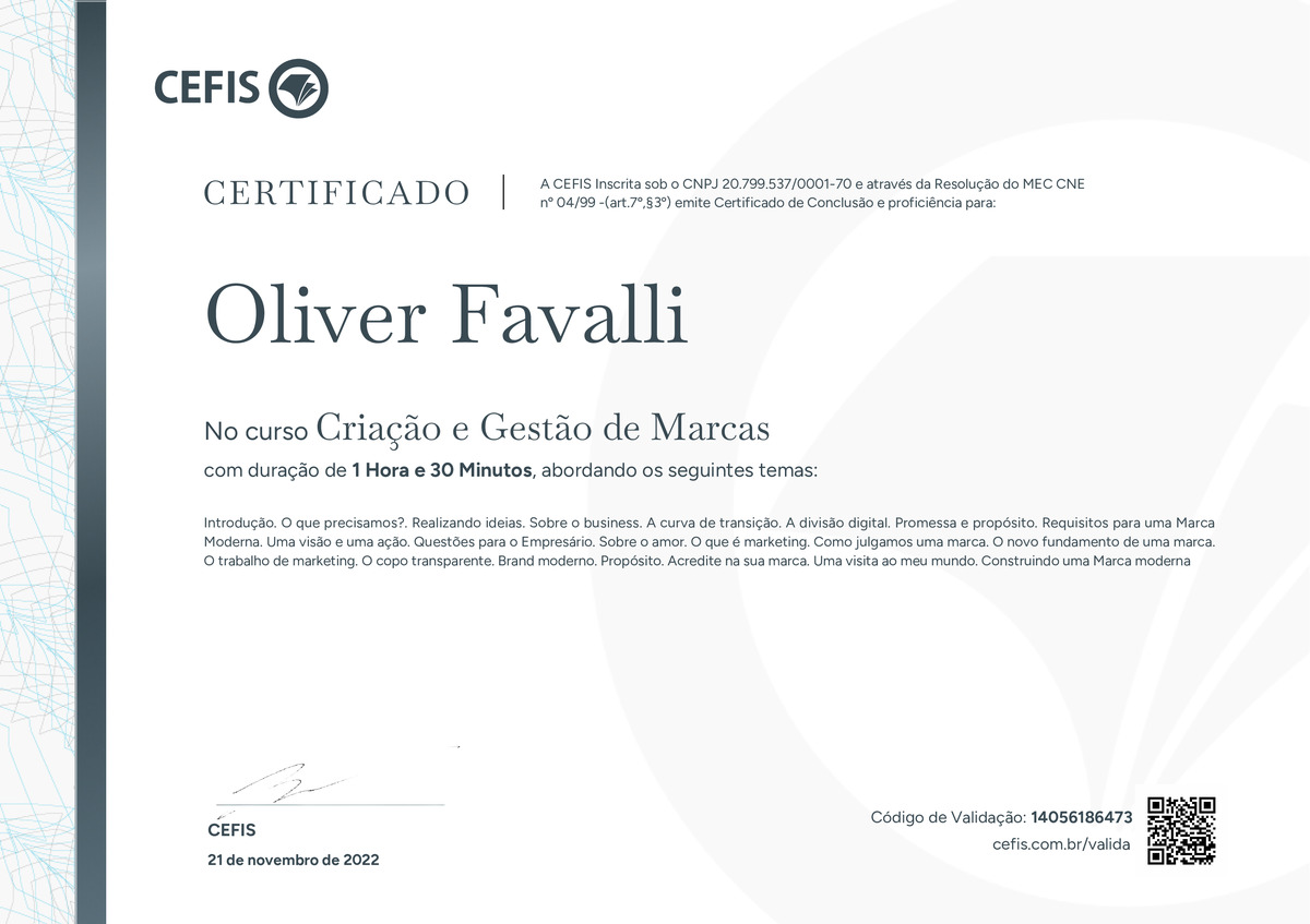 O certificado acima atesta que Oliver Favalli concluiu com êxito o curso Criação e Gestão de Marcas em 21/11/2022 às 21:11:41,