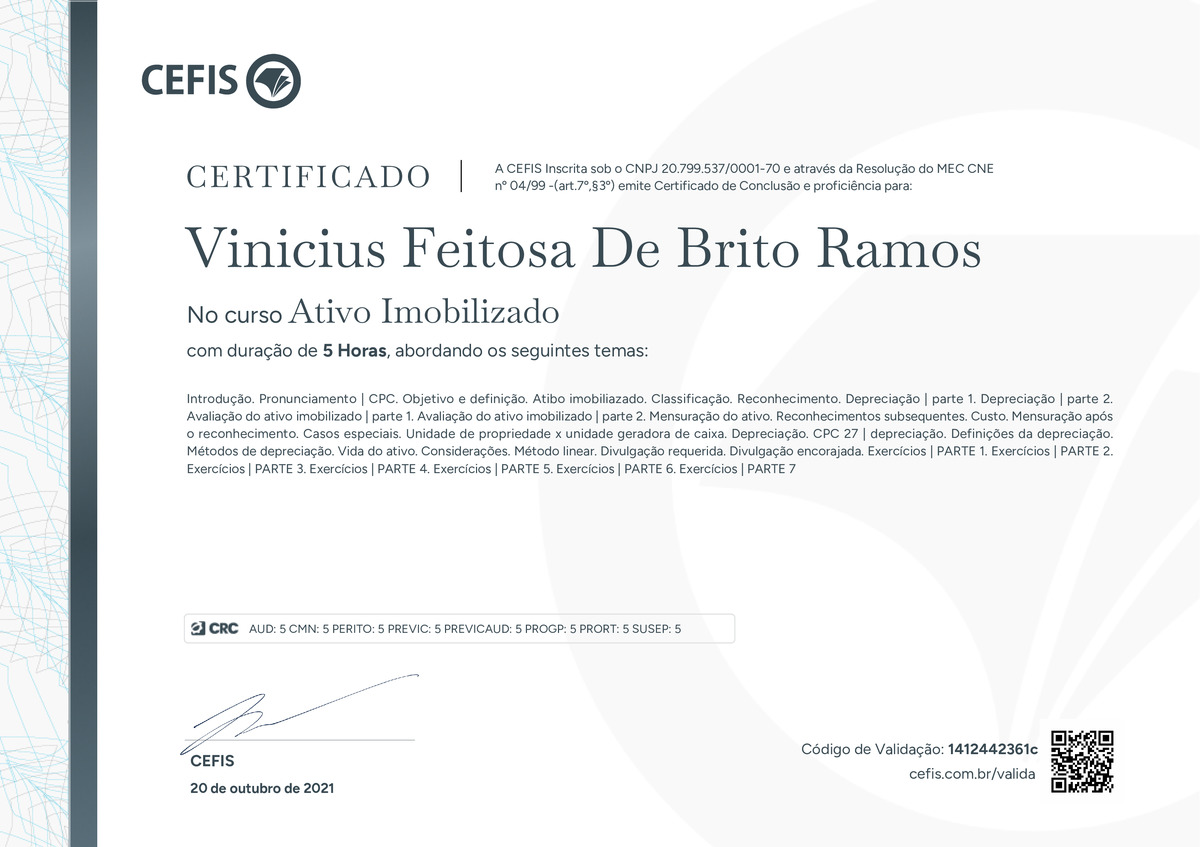 O certificado acima atesta que VINICIUS FEITOSA DE BRITO RAMOS concluiu com êxito o curso Ativo Imobilizado em 20/10/2021 às 21:10:55,