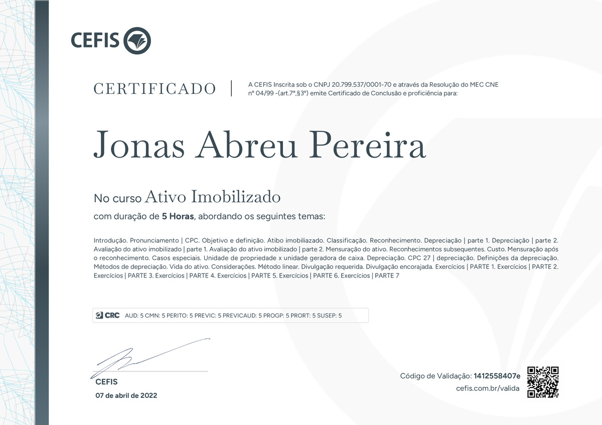 O certificado acima atesta que JONAS ABREU PEREIRA concluiu com êxito o curso Ativo Imobilizado em 07/04/2022 às 21:04:27,