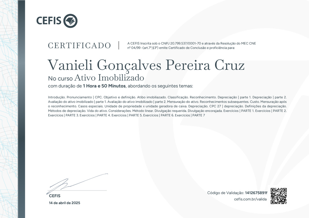 O certificado acima atesta que VANIELI GONÇALVES PEREIRA CRUZ concluiu com êxito o curso Ativo Imobilizado em 14/04/2025 às 20:04:09,