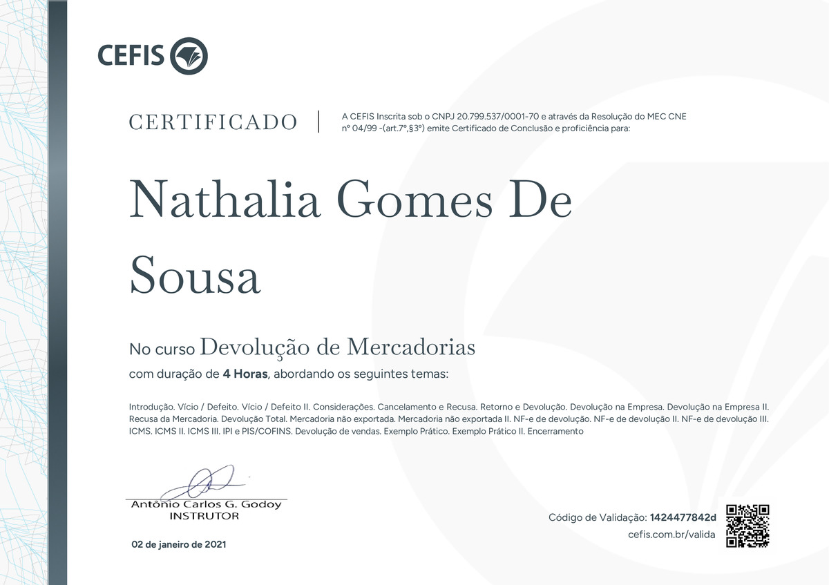 O certificado acima atesta que Nathalia Gomes de Sousa concluiu com êxito o curso Devolução de Mercadorias em 02/01/2021 às 20:01:01, ministrado por Antônio Carlos Godoi.