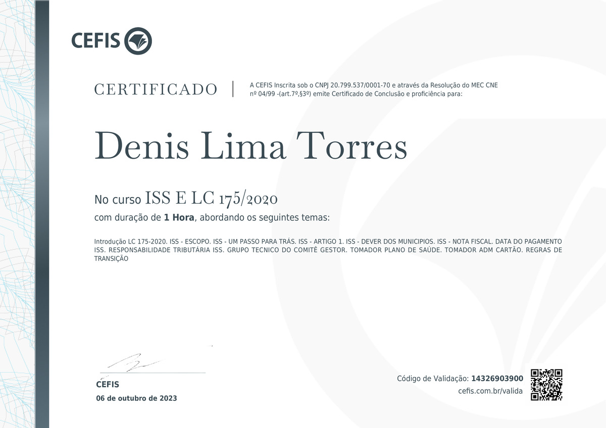 O certificado acima atesta que Denis Lima Torres concluiu com êxito o curso ISS E LC 175/2020 em 06/10/2023 às 20:10:20,